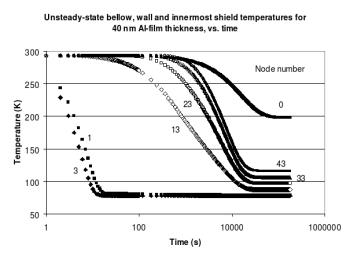 Bild 2 zeigt Ergebnisse der zeitabhängigen Berechnung der Hals- und Wandtemperaturen (Knoten 0, 1 und 3) und der Folientemperaturen (Knoten 13, 23, 33 und 43 für die innersten Folienlagen) der Folien-Superisolation, die um den Tank mit dem flüssigen Stickstoff gewickelt ist.