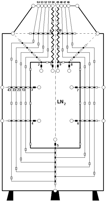 Bild1: Thermisches Netzwerk (schematisch) eines mit evakuierten Folien superisolierten Kryotanks, hier für flüssigen Stickstoff; stark vereinfachte Darstellung (Klöpper- böden nicht eingezeichnet, Dimen- sionen der Flüssigkeits- zuführung (Hals) stark übertrieben, Folien und Spacer sind in den dünnen Linien zusammengefaßt, nur die innersten Folienlagen sind angedeutet). Kleine volle und große offene Kreise: Positionen (Knotenpunkte), an denen Temperaturen berechnet bzw. als Randbedingungen vorgegeben sind, gepunktete, offene oder volle Rechtecke: Wärmewiderstände bezüg- lich Festkörperwärmeleitung, Strah- lung oder Konvektion oder Sieden. Die dünnen oder dicken Linien geben gleichzeitig die Richtung der Wärmestrompfade wieder. Am Boden überlappen die Folien auf der ganzen Fläche (nicht dargestellt). Für jeden Knoten gelten die Kirchhoffschen Gesetze. |