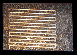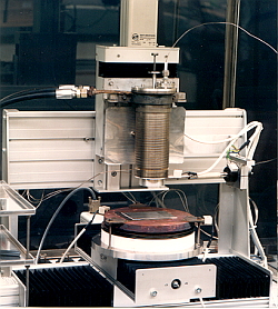 Lotschreiber (linkes Bild) mit Mariottescher Flasche als Vorratsbehälter, Keramikschreibkopf (Kapillare), in xy-Richtung verfahrbarem Probenhalter (Heizfläche), alles unter Schutzgas, zum Auftragen von Weichlot auf vernickeltem Cu (mittels "direct bonding" auf einem Keramikplättchen präpariert); rechtes Bild: mit dem Lotschreiber aufgetragene, dünne mäanderförmige Lotbahnen.