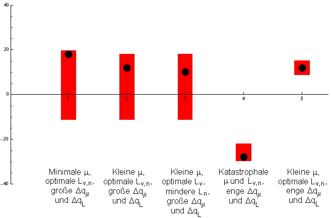 großen Spreizungen sowie die Ergebnisse für den Fall katastrophaler Vorgaben. Die oberen und unteren Intervallgrenzen der Erwartungswerte hinsichtlich sind gleich, unterschiedlich sind jedoch die Tendenzen, so daß unter diesen drei Optionen das Ergebnis nach Gl. (4a) mit den optimalen Vorgaben das günstigste sein könnte, wäre da nicht die stark negative Unsicherheit, welche einen Mißerfolg nicht ausschließt.